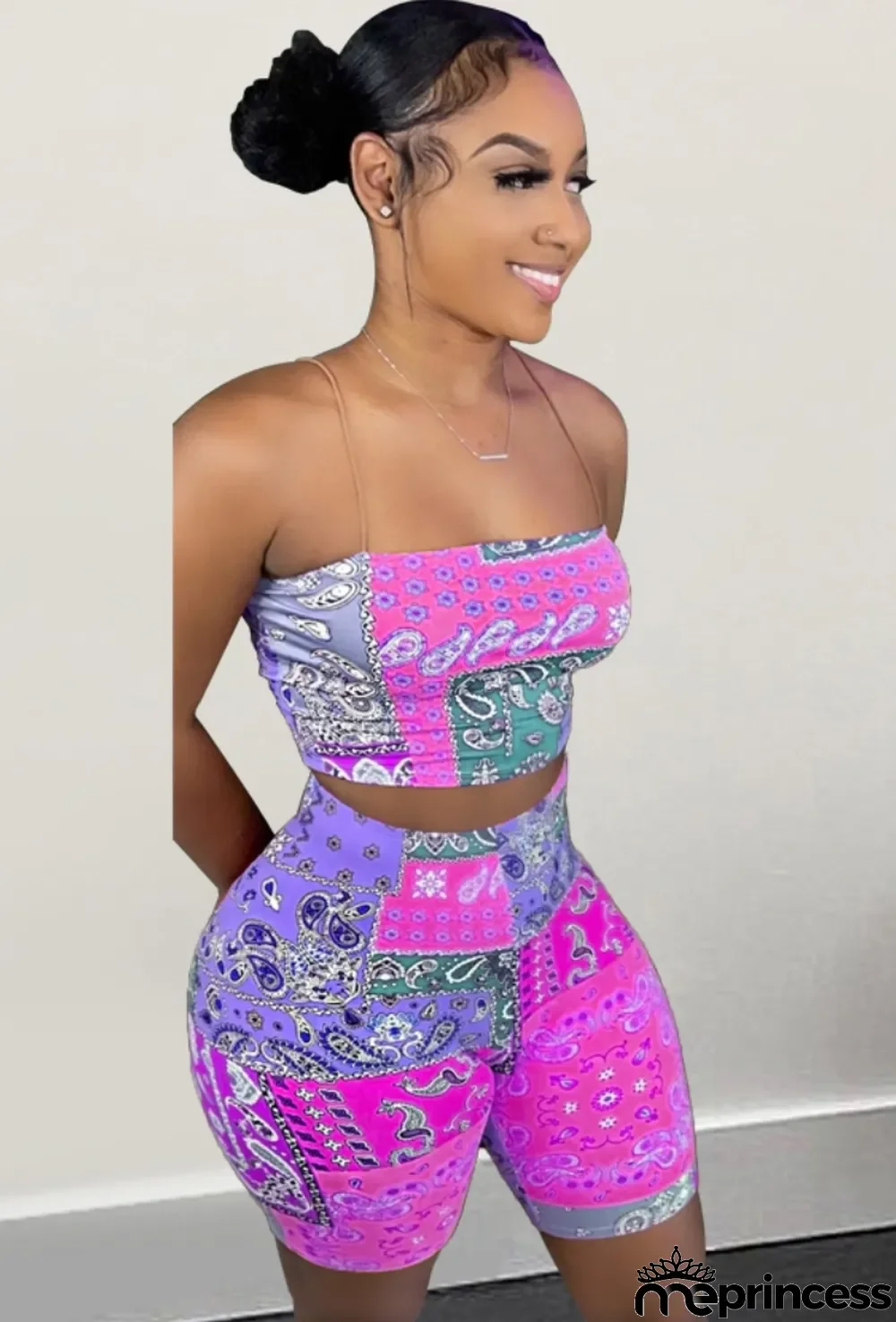 Product Name Summer Print Retro Sexy Strap Crop Top and Biker Shorts 2 Piece Set